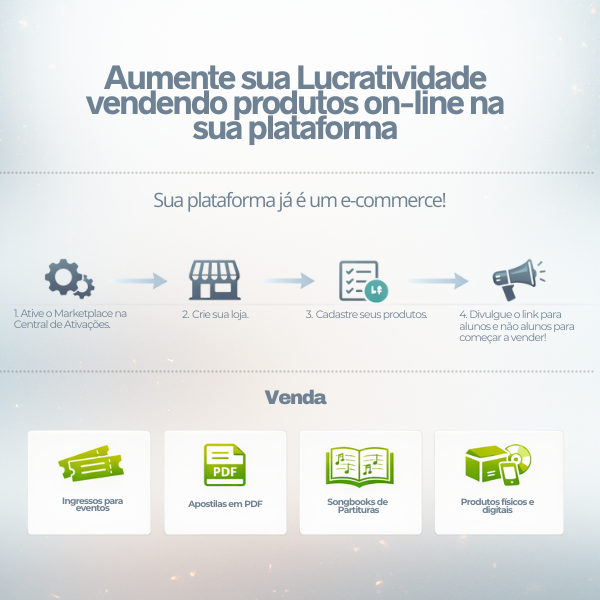 Venda PDFs, apostilas físicas e digitais, partituras, repertórios, arranjos, cursos, material dos seus professores com split automático de pagamento, ingressos para apresentações, instrumentos e acessórios musicais, e muito mais!
